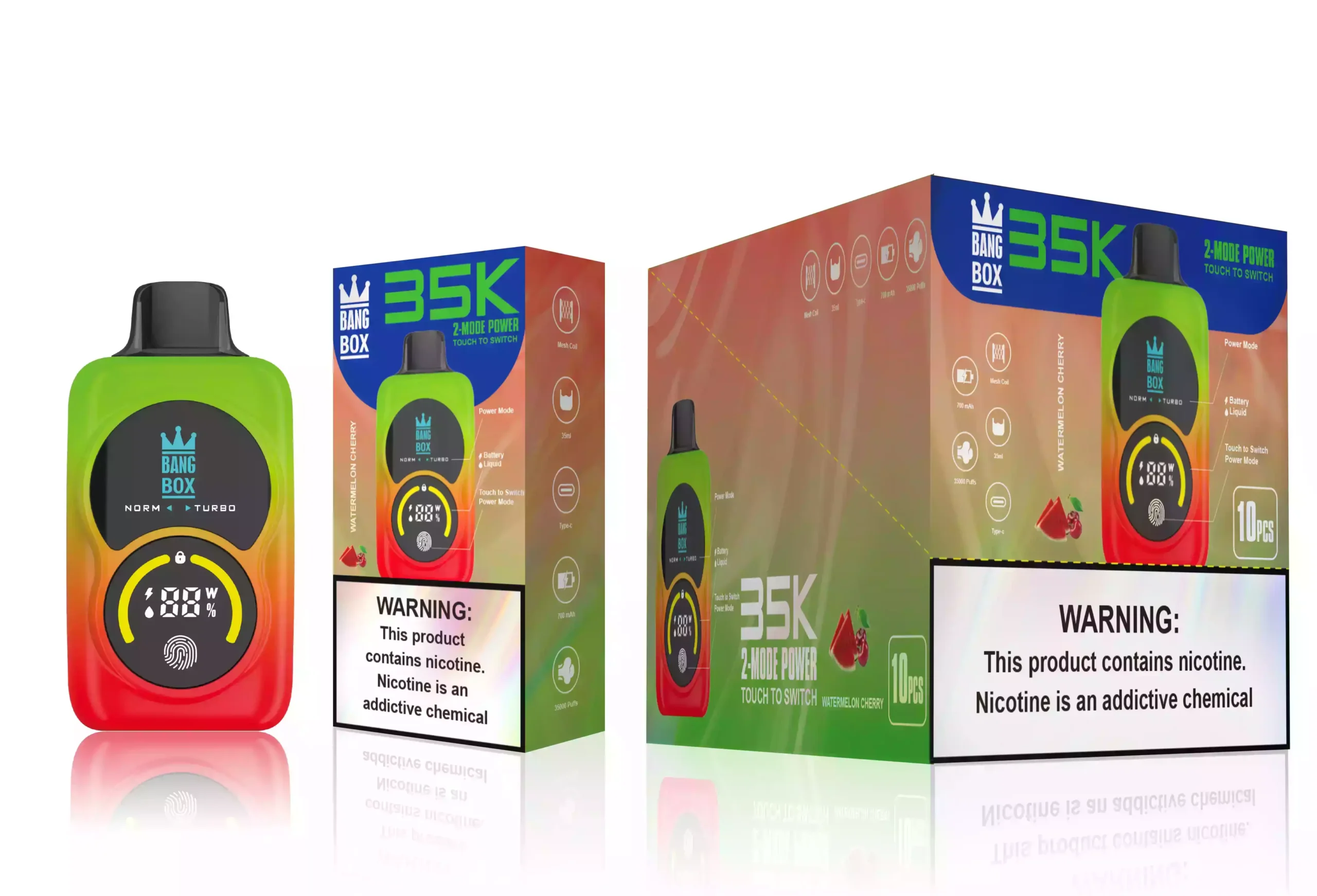 BANG BOX 35000 Puffs Disposable Vape ofrece hasta 35,000 puffs con un Batería de 950 mAh y bobina de doble malla technology for smooth, flavourful hits. Available in 0%, 2%, 3% y 5% nicotina, with exciting flavours like Watermelon Ice & Strawberry Kiwi.