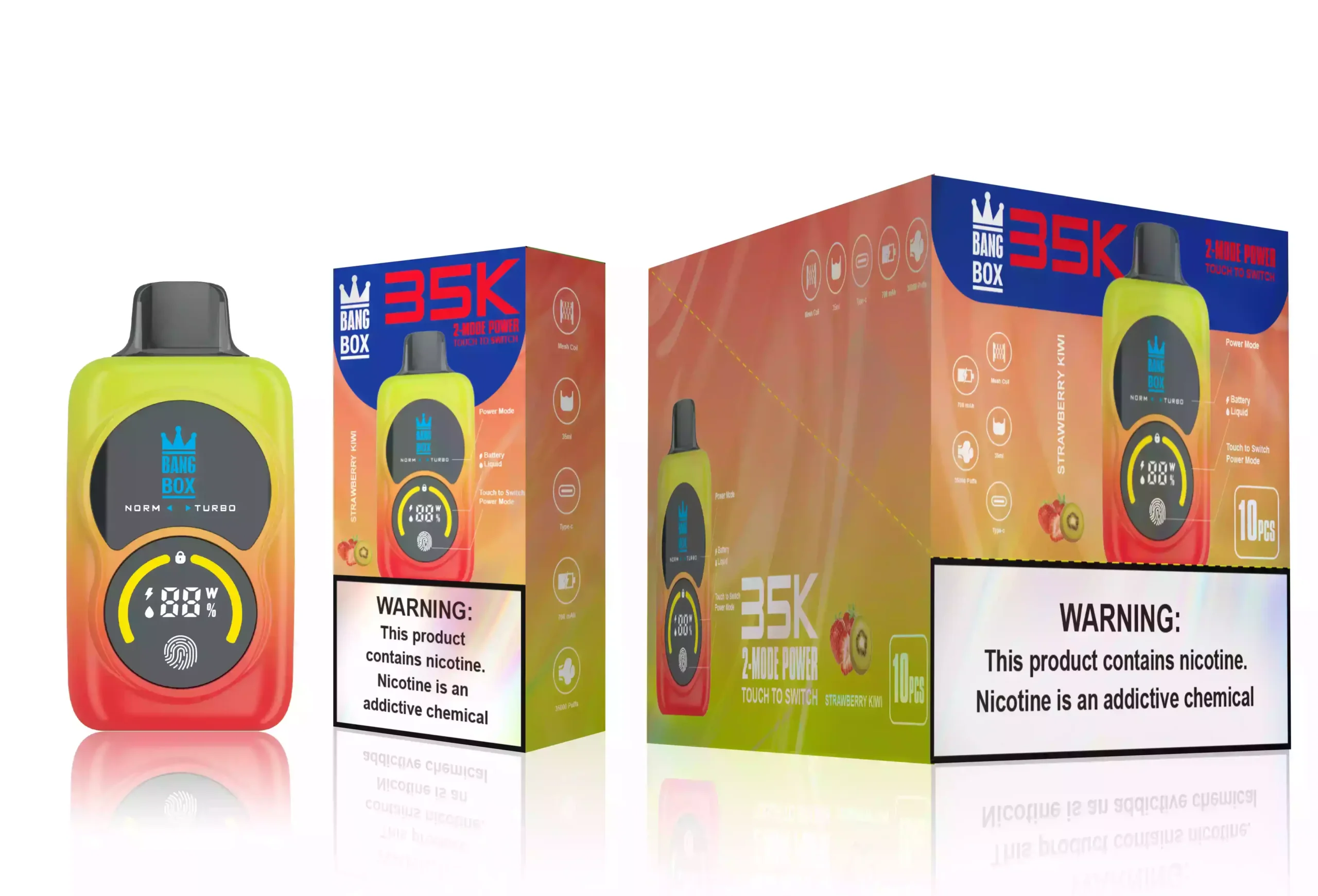 Available in a range of mouth-watering flavours such as Watermelon Ice & Strawberry Kiwi, Blueberry Ice & Peach Juicey Strawberry Watermelon & Kiwi Passion Fruit Guava, the BANG BOX 35000 promises a rich, full-flavour vaping experience. With a sturdy build, it is designed to handle all your vaping needs without compromising on convenience or performance.