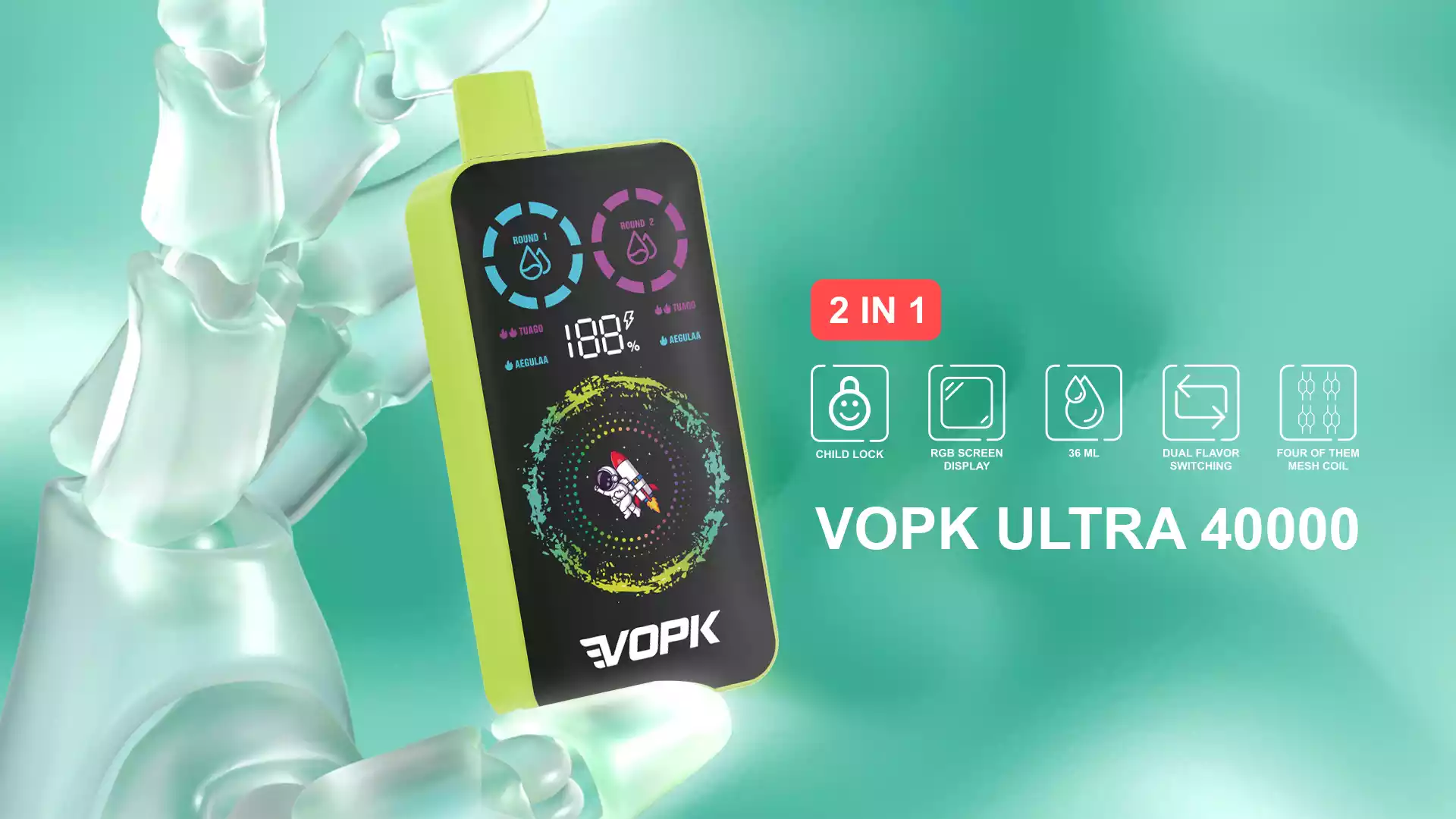 The device is pre-filled with 36mL of premium e-liquid and comes in various nicotine strengths—0%, 2%, 3%, and 5%, catering to all preferences. With a mesh coil atomizer core, the VOPK ULTRA delivers smooth, satisfying hits with enhanced flavor. Additionally, the child lock, left and right flavor switch, and UV printing give you a secure, customizable vaping experience.
