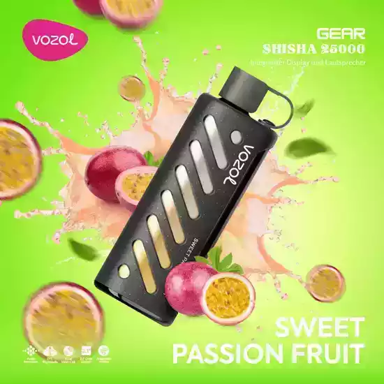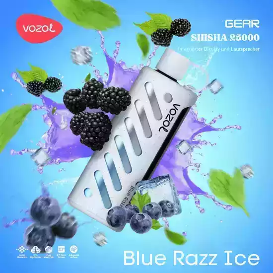 The Vozol Gear Shisha 25000 Puffs comes with 5% nicotine, 25mL e-liquid, and exciting flavors like Blue Razz Ice and Sweet Passion Fruit, delivering a long-lasting and flavorful vaping experience.