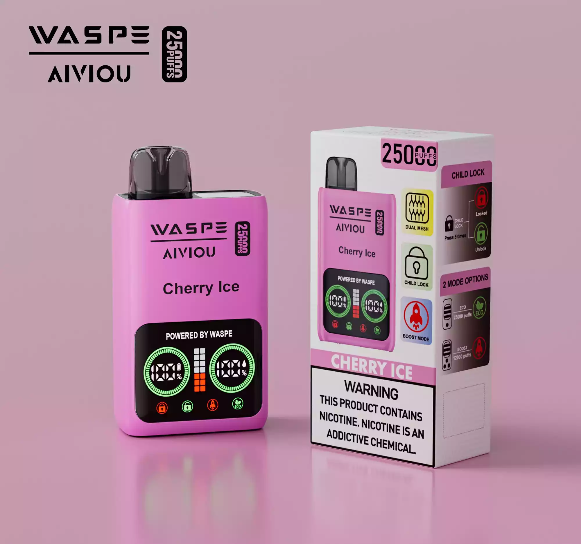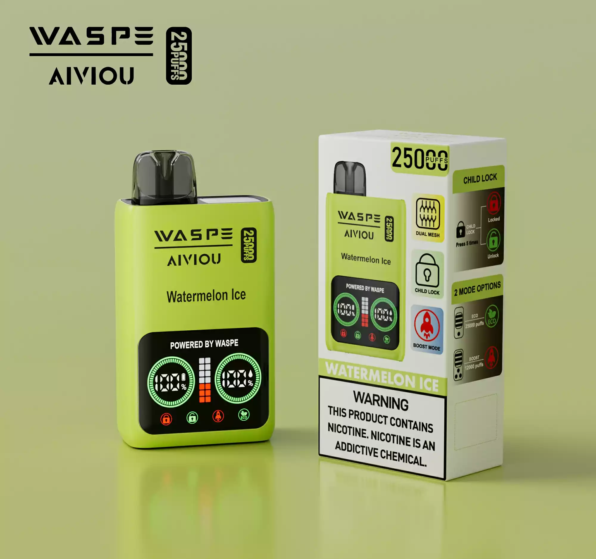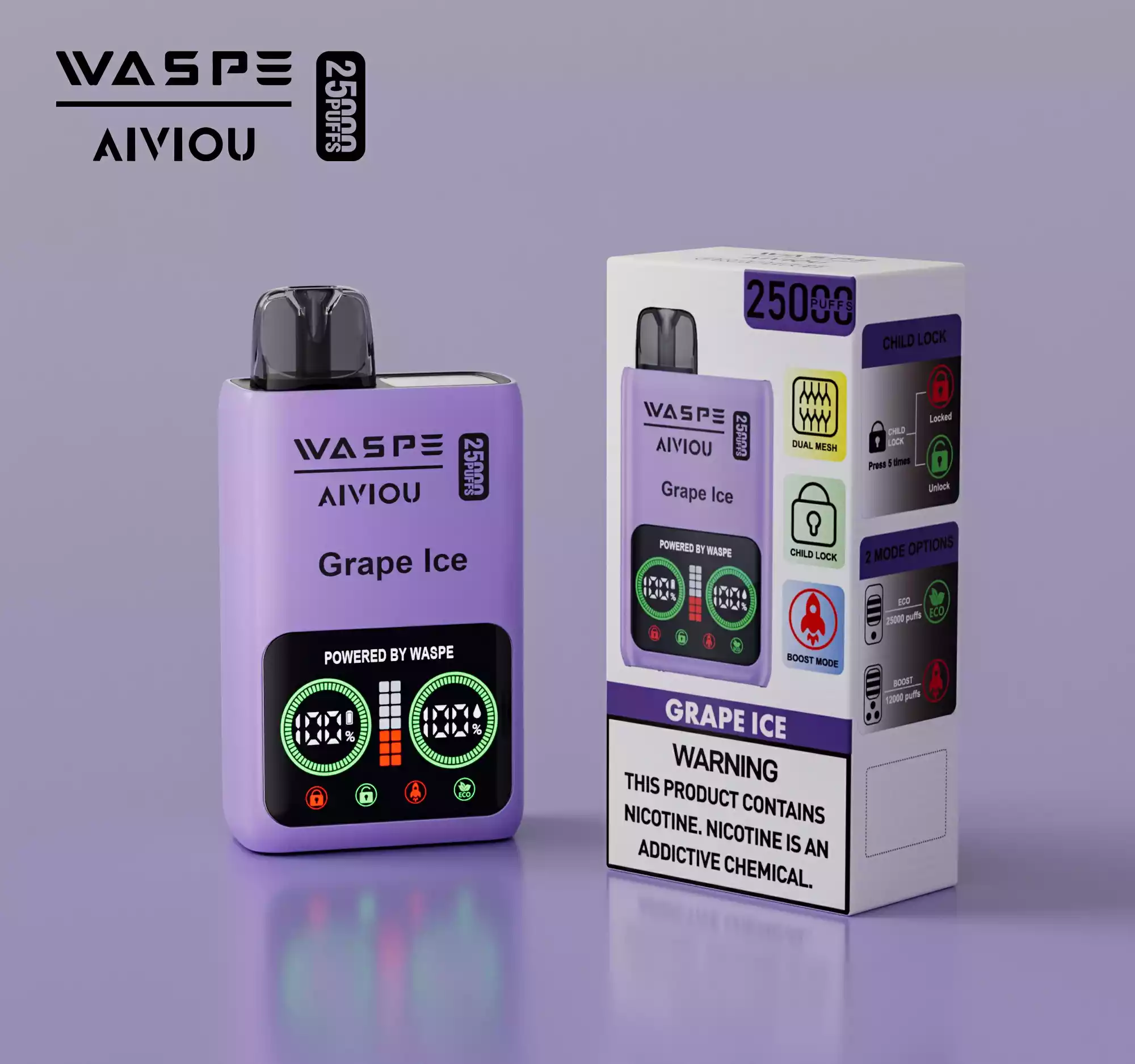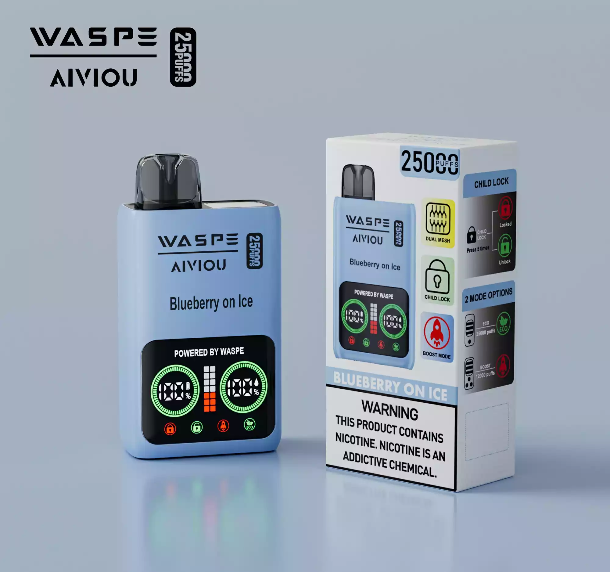 With a variety of 10 unique flavors such as Watermelon Ice, Blueberry Raspberry Lemonade, and Peach Mango Watermelon, the WASPE 25000 Puffs disposable vape offers something for every vaper. Whether you’re craving fruity, icy, or refreshing notes, this device has you covered. Plus, the LCD display lets you easily monitor the remaining e-liquid and battery life, making it even more user-friendly.